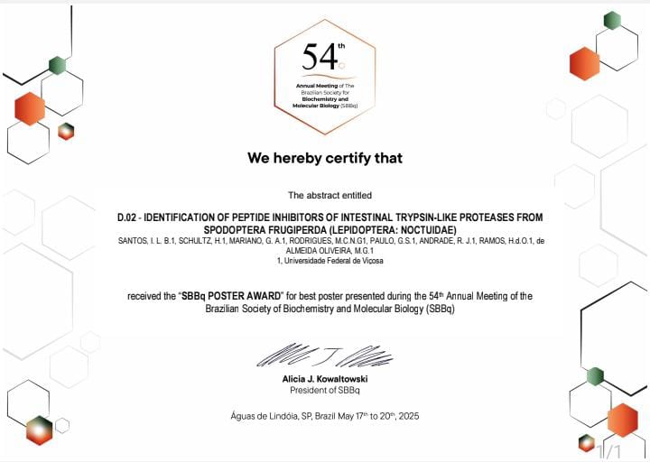 O estudante Ian Lucas Batista Santos recebeu o prêmio de melhor poster na 54th Annual Meeting of The Brazilian Society for Biochemistry and Molecular Biology. O trabalho apresentado insere-se na área Interações entre Plantas e Insetos representada pelo subprojeto 12, coordenado pela Profa. Maria Goreti de Almeida Oliveira.